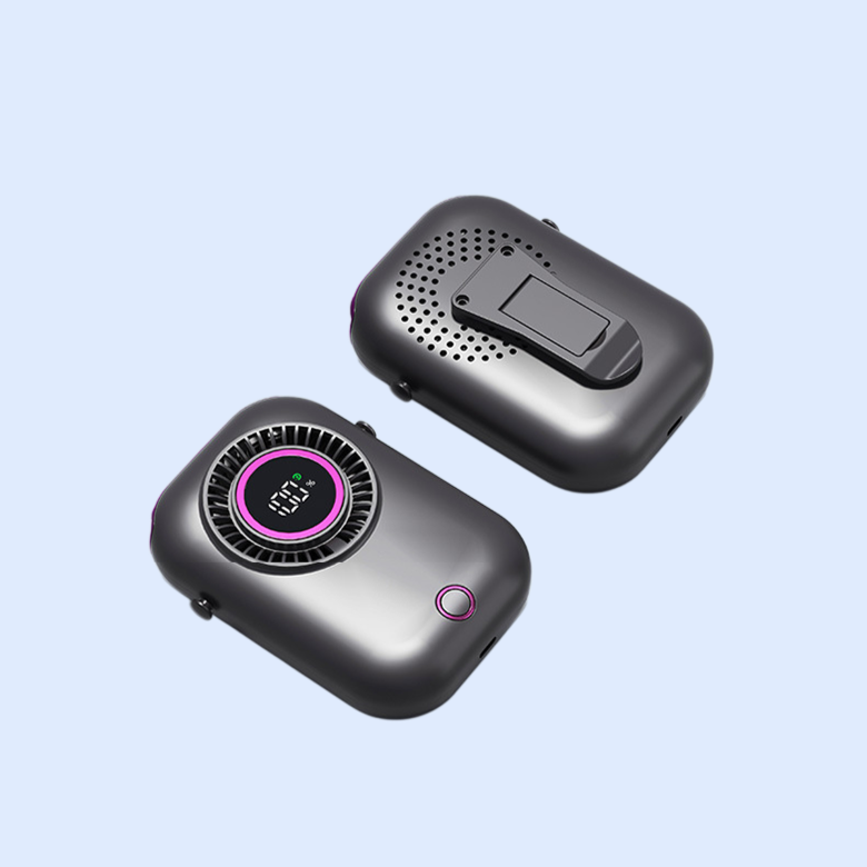 Portable mini neck and waist hanging fan, lightweight design, USB rechargeable, quiet operation, hands-free use, adjustable speed, suitable for outdoor and indoor activities.